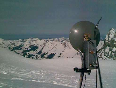 Nous sommes montés, Charlie HB9VJS et moi (+ les xyl), au glacier des Diablerets dans les Alpes vaudoise le dimanche 23 février 1997. Le but était d'étudier les possibilités d'y établir une station-relais provisoire en vue de retransmettre des images de l'expédition d'août 1997 au Cervin (F6DXC). Après une montée périlleuse (crête de neige fraîche, vide à gauche, vide à droite et déconseillée par les gardiens du téléphérique) qui a vu HB9AFO à presque renoncer (mais que ne ferait-on pas pour l'ATV!...) et Charlie et Christine (VJS's xyl) gambader sur cette crête comme des chamois (!), nous avons dû changer une première fois d'emplacement, celui-ci étant masqué par l'ultime sommet du Scex Rouge dans la direction du Jura. Après une courte descente à ski, nous nous sommes installés une crête plus solide, plus basse mais mieux dégagée dans la direction souhaitée. Malheureusement HB9DLH/P, situé à Mauborget, sur la pente du Jura au-dessous du Chasseron, ne recevait toujours pas nos images 10 GHz. Nous nous sommes déplacés encore une fois pour essayer de trouver un endroit plus favorable. Et nous l'avons trouvé au sommet d'un téleski, toujours sur la même crête mais plus haut et plus au Sud et là ça a marché. Rémy HB9DLH nous a reçu B5++ ainsi qu'Henri HB9VJU depuis son QTH de Senarclens, au nord-ouest de Lausanne. Une retransmission serait donc possible dans cette direction mais, malheureusement, le Cervin n'était plus visible de puis là et aucun bâtiment ne pourrait abriter un opérateur. Les enseignements de l'expérience: