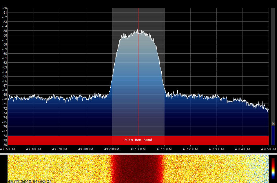 Le 15 mai 2018, la porteuse de HB9IAM est arrivée pour la première fois 20 dB au-dessus du souffle avec une antenne plate (30x30cm, 17dBi) sur le toit mais pas encore assez fort pour pouvoir décoder une image. Avec une propagation de nuit très erratique comme on peut le voir sur la figure ci-dessous sur le signal de F5DB.