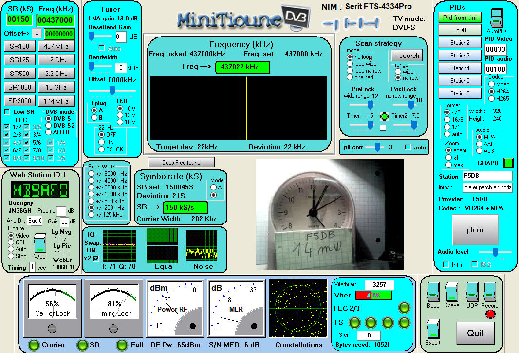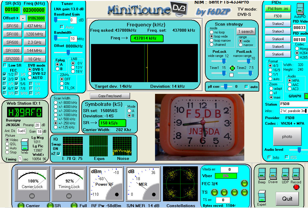 Aux derniers essais, Le signal de Bernard arrive 13-14 dB au-dessus du bruit. Cela donne un confortable MER de 12-13 dB sur Tutioune. Il a actuellement 2 Watts (sortie TX) dans sa parabole de 3 mètres de diamètre.