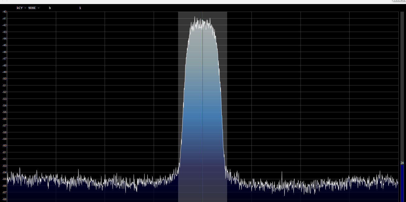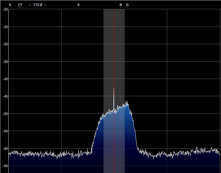 Avec Bernard F5DB: 90 Watts dans une parabole de 1,2 m. Moi antenne plate en réception Meilleure QRG:2386.5 MHz. Spectre à 16dB mais porteuse au centre à 20dB. Aussi idem à 2380 MHz Puissance min: 12 Watts