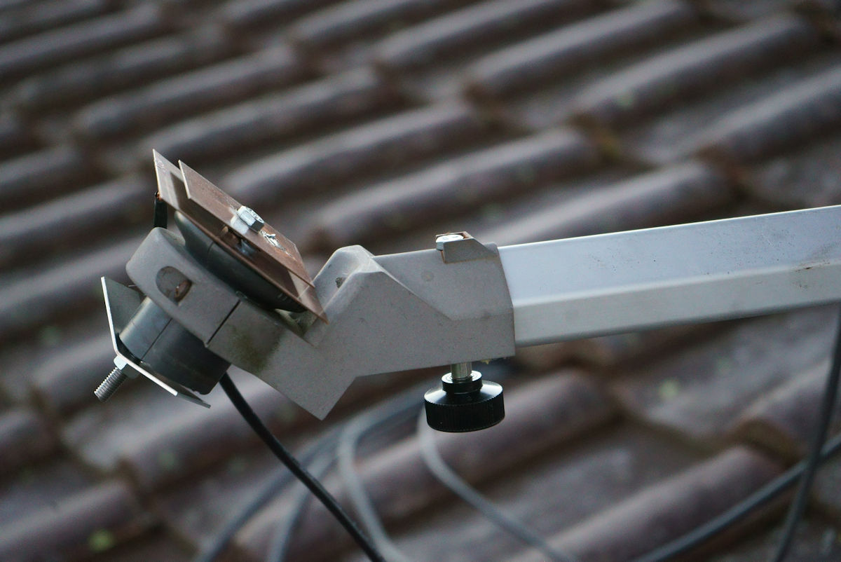 J'ai tout d'abord modifié le LNB de façon à le retourner de 180 degrés car sa fixation d'origine le destinait à une petite parabole grillagée. Je l'ai ensuite fixé sur le bracon de la parabole Visiosat de 90cm (92 x 105 cm) au moyen d'un méplat d'alu sur lequel je pouvais déplacer le LNB afin de trouver son emplacement exact au foyer de l'antenne. Cette dernière se trouvait au sol, sur la terrasse, à l'endroit d'où j'avais contacté Bernard sur 10 GHz.