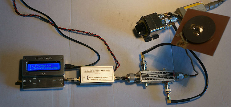 Après bien des essais avec divers coupeurs, j'ai fini par pouvoir effectuer la mesure du TOS. Je l'ai fait au moyen du banc de mesure constitué par un générateur moRFeus, un amplificateur DB6NT (20mW-700mW), un coupleur "EME precision UHF-VHF directional coupler", un commutateur entre "direct" et "reverse" et un bolomètre Hewlett-Packard 435". Auparavant j'avais raccourci la probe de 33 à 29mm afin d'être plus près du quart d'onde, et aussi rapproché la prise SMA de 3 mm du fond du guide d'onde afin de respecter les mesures faites par F5DB sur un cornet d'origine Tonna. La mesure a donné entre 12 et 15dB entre direct et reverse, ce qui fait un ROS dans les 1,5:1 ce qui est excellent. Le cornet est centré sur 2360 MHz mais le TOS est quasiment constant entre 2300 et 2400 MHz. L'objectif est donc réalisé.