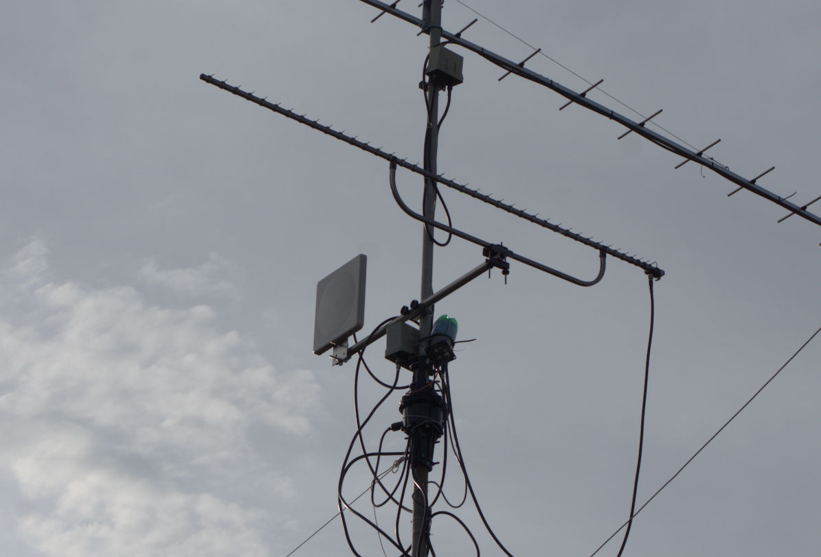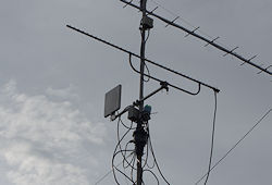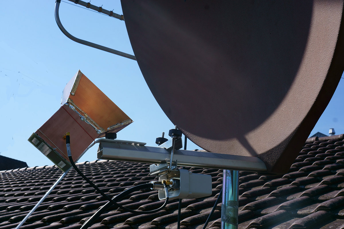 Sur le toit, il y a une antenne 2300 MHz Flexa Yagi de 1,8 M de long en polarisation horizontale. Suivie d'une préamplificateur télé-alimenté (convertisseur 13-23cm de DG0VE modifié en préampli)