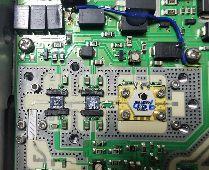 L'amplificateur du transceiver est équipé d'un TG4905 au final (en théorie 3Watts sur 24GHz) précédé d'un TGA4902 et TGA4510. Si je n'arrive pas à transformer ce transceiver pour le 24GHz, je l'utiliserai en tant que PA 24GHz en l'attaquant à la sortie du filtre qui le précède qui est accordé sur 29.5-30GHz.