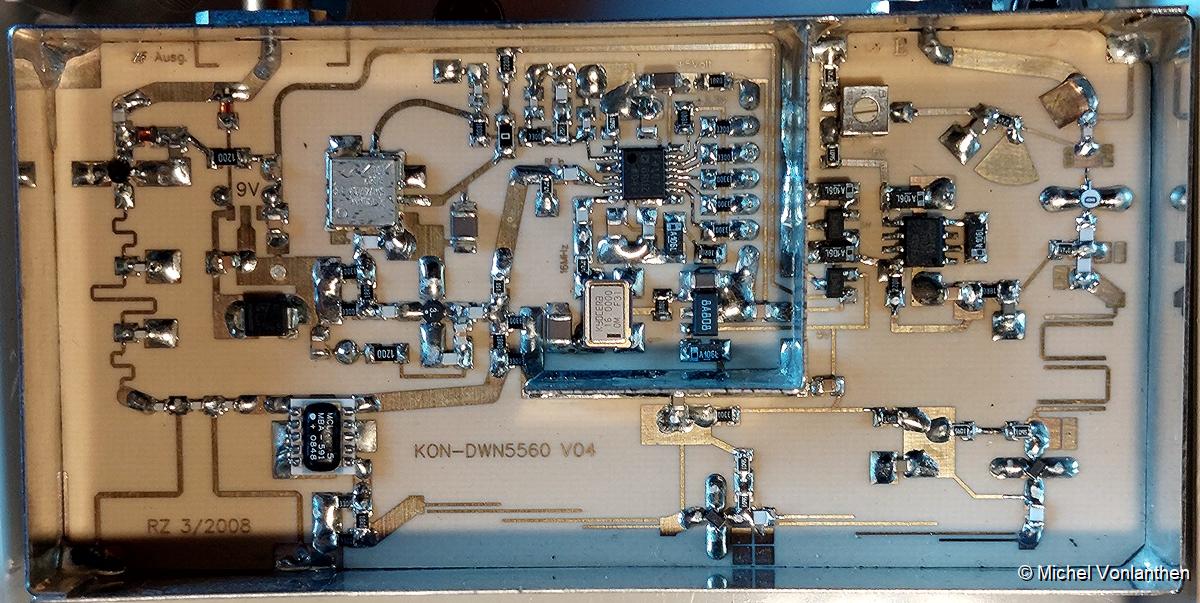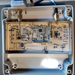 Input: 5.5 - 6 GHz (5'720 MHz) output: 450 - 1600 MHz (1020 MHz) Gain: 40dB LO: 4.7GHz stabilisé PLL NF: 1.2dB Alimentation: +12V par la prise de sortie