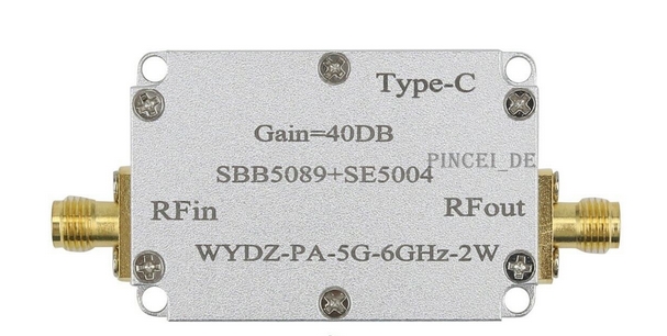 Spécifications: Fréquence: 5.7 GHz Puissance: 2 Watts Gain 40dB Alimentation: 6V/2A (prise USB-C) A monter sur radiateur (non fourni)