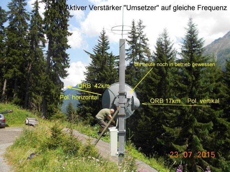 La séparation entre entrée et sortie se fait en croisant les polarisations et en utilisant des paraboles directives. D'autre part, le gain n'est que de 60dB, prévu pouir de la télévision mais insuffisant pour un relais radioamateur. Le principe est cependant intéressant à voir être mis en pratique, cela donne des idées...
