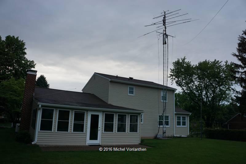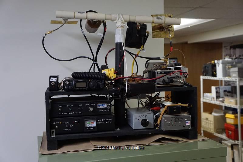 John est actif sur toutes les bandes mais actuellement surtout en 1296 MHz EME grâce à sa parabole de 3m. Son système de pilotage site-azimuth est manuel, les images des capteurs situés sur la parabole sont visualisés sur un écran TV dans son shack. Les antennes qui sont sur son mât lui permettent de trafiquer sur toutes les bandes hyper usuelles aux USA. Il m'a fait la démonstration de la balise multibande qu'il a construite et placée à quelques dizaines de kilomètres de chez lui. Son atelier est bien équipé du point de vue outils et aussi du matériel de réserve et de la documentation. Plusieurs des équipements qu'il utilise en portable y sont stockés, de même que d'anciens équipements, comme par exemple, sa première station 144, son antique récepteur TV, certaine encore là pour lui rappeler qu'il fut un amateur de TV parmi les plus actifs des USA, d'ailleurs membre fondateur de l'ATNA.