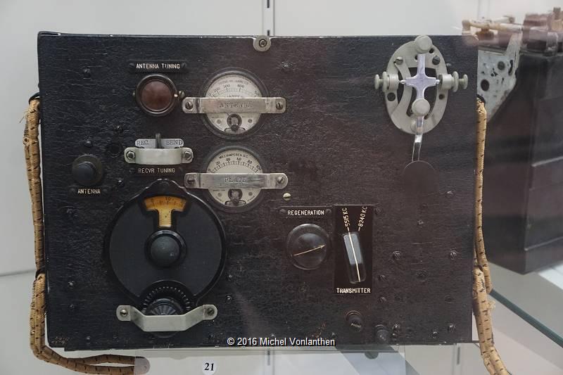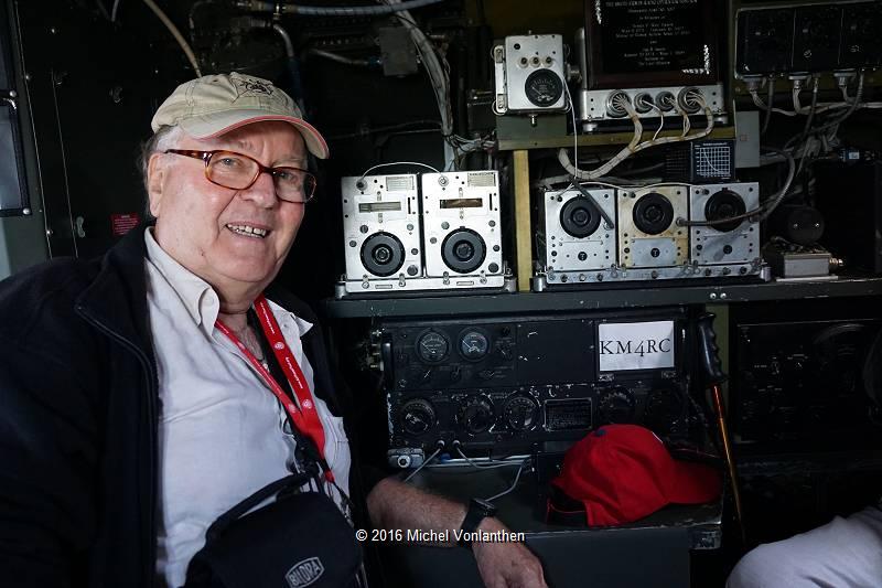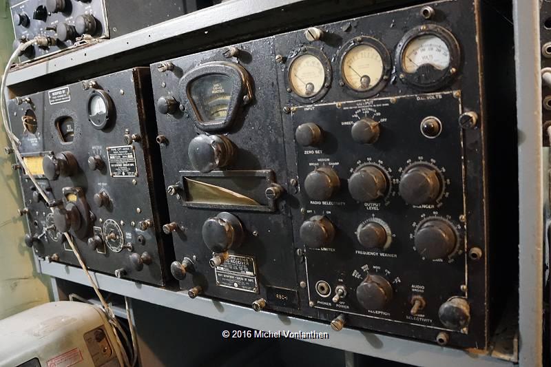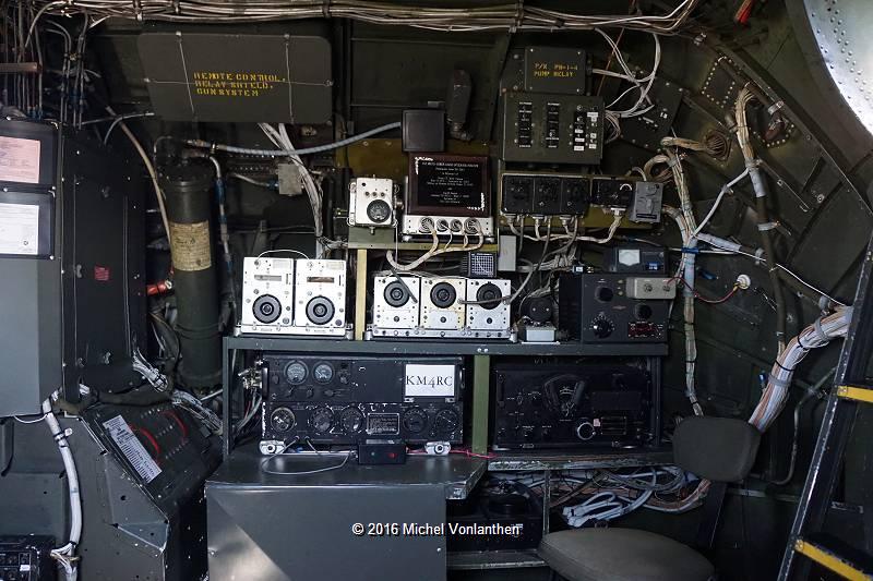 Avec, de g. à dr: 2 émetteurs, 3 récepteurs, la dynamotor (sorte de moteur) qui fabrique la haute tension, au-dessus d'elle les 3 télécommandes mécaniques des récepteurs, plus loin sur la droite la boîte de couplage d'antenne. Dessous de g. à dr: le modulateur AM et sur sa droite le récepteur BC-348. L'antenne est un long fil qui part du toit du cockpit et va jusqu'au gouvernail de direction. La station utilise le call KM4RC. Pour la vol de l'avion, ce sont des équipements radio modernes qui sont utilisés.