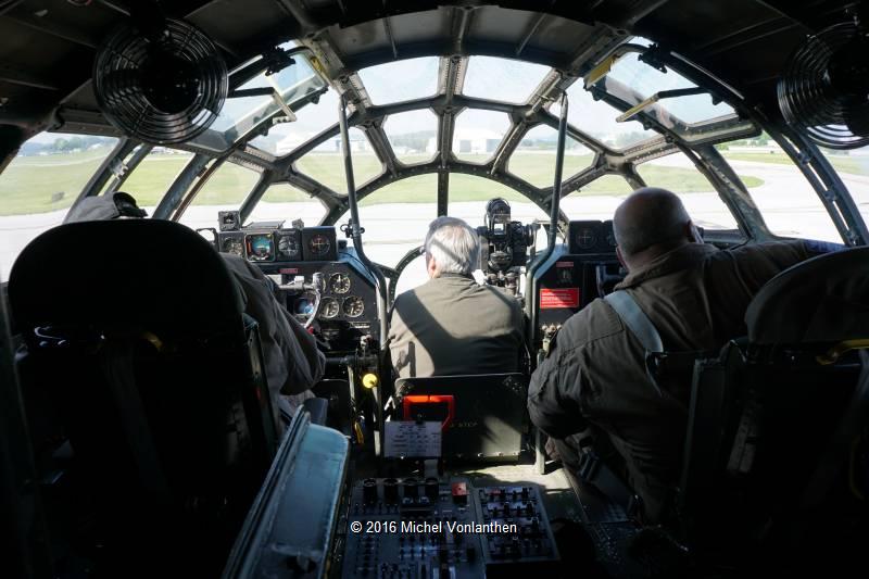 Malheureusement pour mon vol, la météo n'était pas très bonne, le vent soufflait ce qui empêchait le B-29 de décoller. Les nombreux autres avions purent cependant le faire comme prévu. Nous étions 6 passionnés à avoir réservé nos places dans cet avion, 3 devant (radio, navigateur et observateur, moi) et 3 derrière comme canonniers. J'avais voyagé 10'000 kilomètres pour faire ce vol et ne voulais pas le rater si bien que je n'ai pas arrêté de harceler les organisateurs, dont la sympathique colonelle Sarah Zimmermann. Je lui ai même demandé si elle était la fille du chanteur Bob Dylan dont le vrai nom était le même que le sien (non, elle n'est pas). A la fin de la journée j'étais devenu leur copain et je m'entendais appeler "Hello Mike, come on" pour m'annoncer une visite du B-29 et le report du vol au lendemain. C'était une faveur car le meeting se terminait le jour-même.